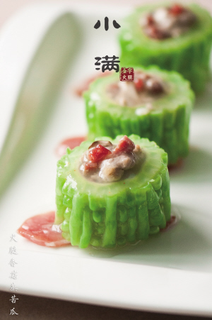 3. 將調(diào)好的餡料塞入苦瓜內(nèi),擺盤(pán),上火隔水蒸8分鐘起鍋即可。
